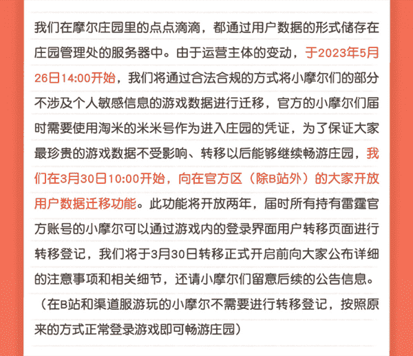 合作结束本就是开发方和代理方双方的事情,,降低这件事情对玩家的影响,,,,才是对所有珍视这段童年的摩尔玩家最好的呵护。。目前看来,,,用户完全不用担心后续因无法登录游戏而造成任何数据上的损失,,,只要及时进行账号转移,,,,就可以好好保留、、、延续在庄园的痕迹和回忆,,,,继续在庄园里做快乐的红鼻子小鼹鼠。。