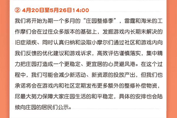 合作的结束并不意味着这个童年IP的结束,,,,对于《摩尔庄园》手游而言,,,这是一个新阶段的开始。。后续游戏内将开启庄园重构计划,,会就以往遗留下来的BUG进行集中修复,,并在游戏内和社区定期发布更多补偿物资。。。。